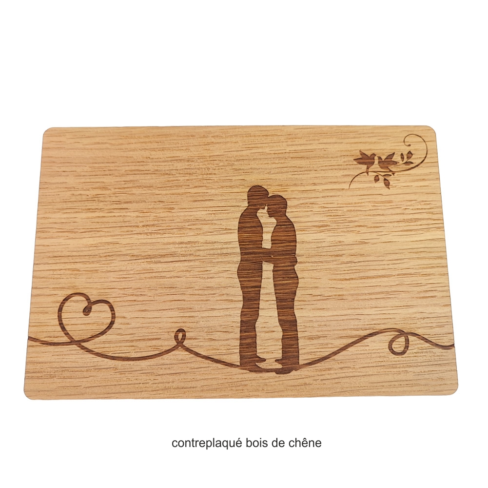 Nos cartes postales personnalisables sont très résistantes et la gravure laser est d’une incroyable finesse et précision. Vous aurez forcément un coup de cœur avec la carte postale bois des Amoureux que vous pourrez personnaliser pour en faire le cadeau unique.
