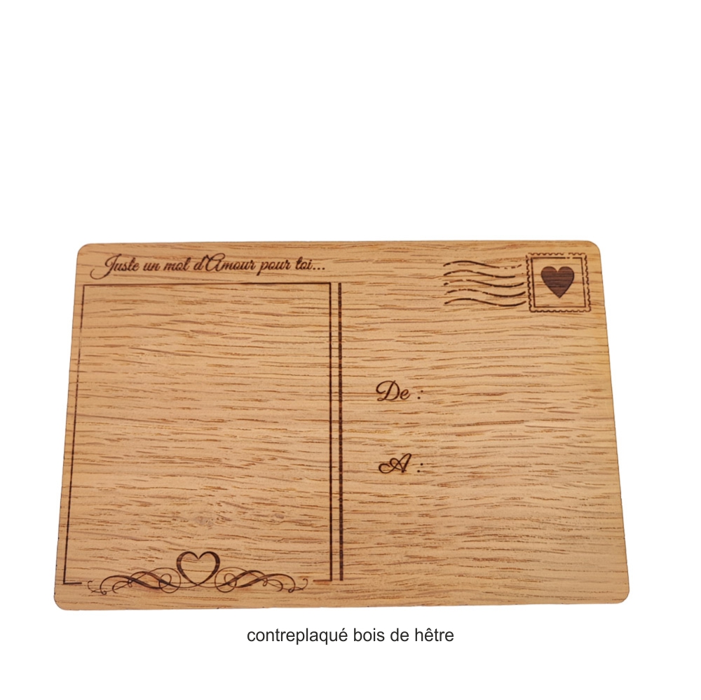 Toutes nos cartes postales bois sont personnalisables au verso. A vous de choisir le modèle qui vous parle le plus. Vous pourrez y ajouter votre texte et vos prénoms.