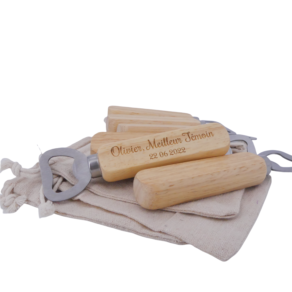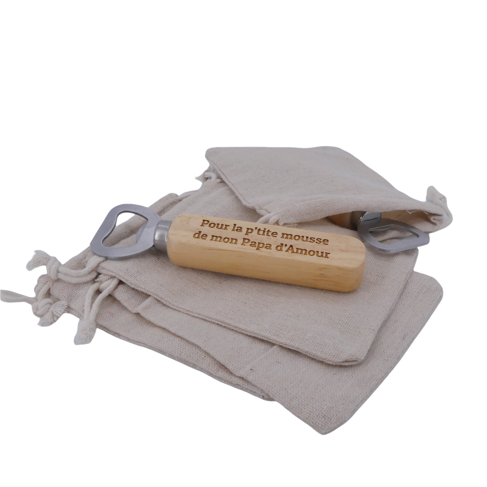 Notre décapsuleur bois personnalisable est une chouette idée cadeau ! Personnalisez le manche avec un texte de votre choix. Vous pouvez personnaliser une face ou les 2 à votre guise ! Cet ouvre-bouteille est très résistant et la gravure laser est d’une incroyable finesse et précision. Offrez-le à l’occasion de la fête des pères ou des grands-pères. Il sera également le cadeau idéal pour votre témoin de mariage ! Tout comme pour un anniversaire, une fête ou Noël. Un cadeau personnalisé fait toujours plaisir ! Vous aurez forcément un coup de cœur avec notre produit que vous pourrez personnaliser pour en faire le cadeau unique.