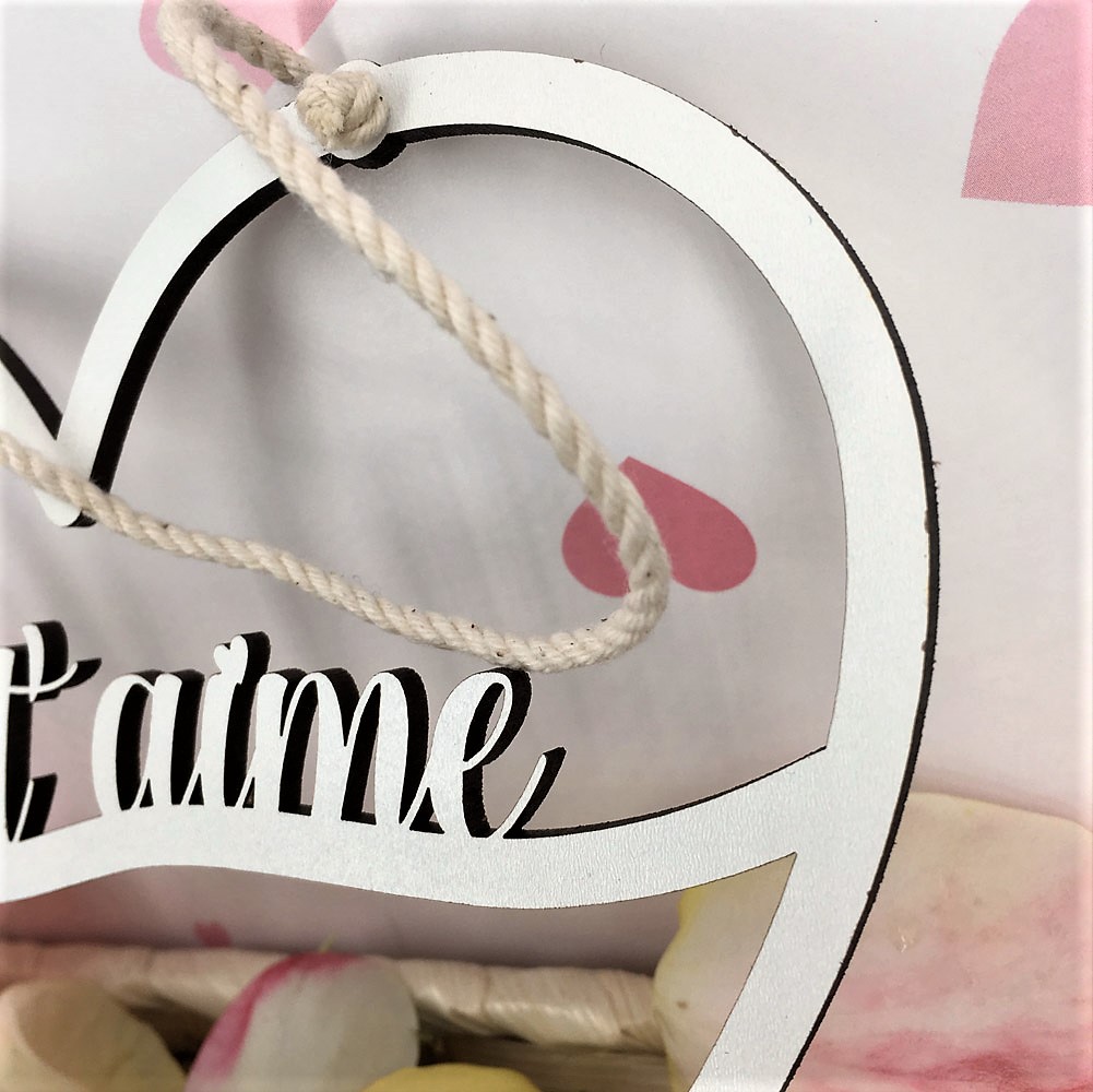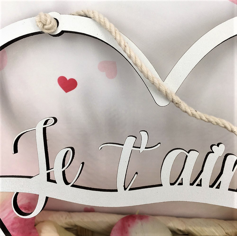 Personnalisez notre Décoration murale Le CoeurDéco je t’aime ! Une jolie décoration murale à accrocher chez vous. Découvrez la finesse de la découpe au laser qui permet de réaliser des décorations originales et très fines. De taille moyenne, cette déco trouvera facilement sa place sur n’importe quel mur, dans la chambre ou dans le salon par exemple. Découpée et gravée dans du médium mélaminé blanc, notre déco se plaira dans tous les styles d’intérieurs.