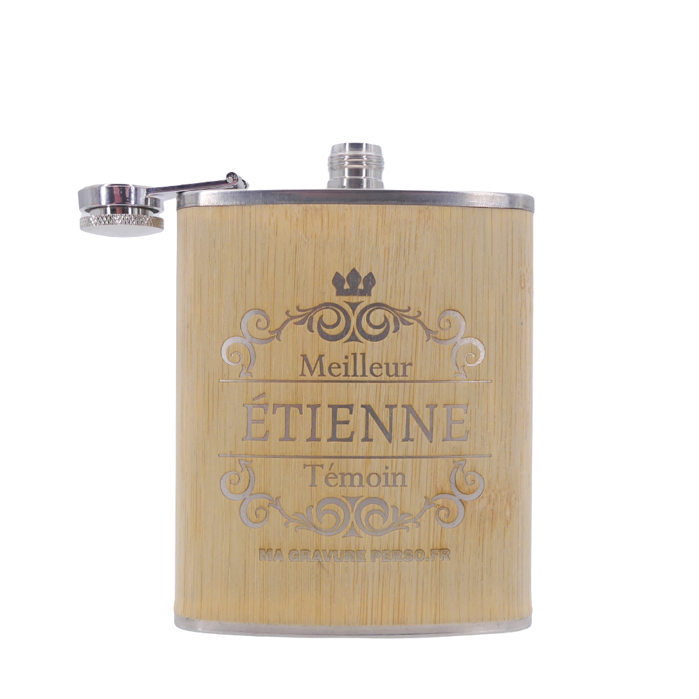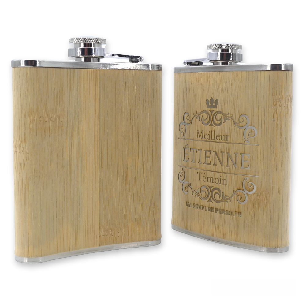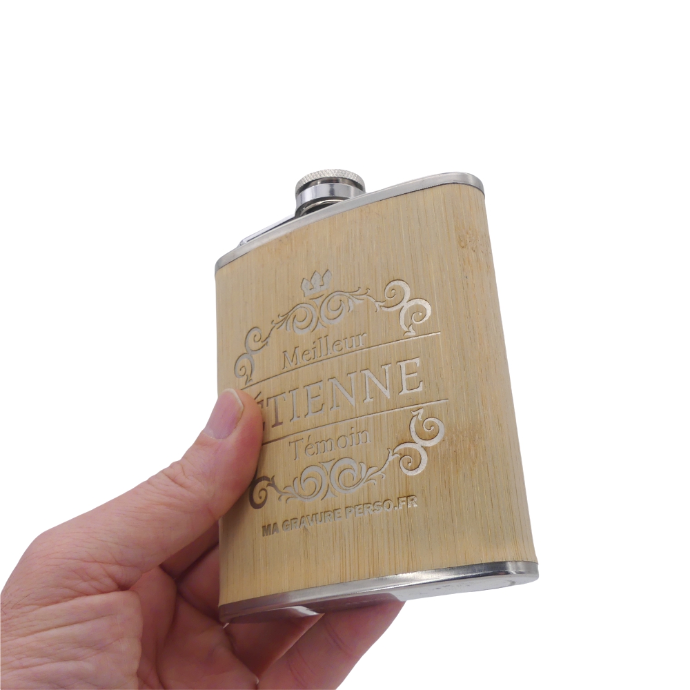 Un joli cadeau, tendance et original pour un anniversaire, un noël, pour un témoin de mariage… Notre Flasque personnalisable Bambou plaira forcément à la personne qui la recevra ! Avec son revêtement en placage très fin de bambou et sa gravure teinte inox, elle a vraiment fière allure. Lors de la gravure nous éliminons la fine couche de bambou pour récupérer l’inox de la flasque. Nos flasques personnalisables sont vraiment très élégantes, leurs finitions en font des objets très raffinés.