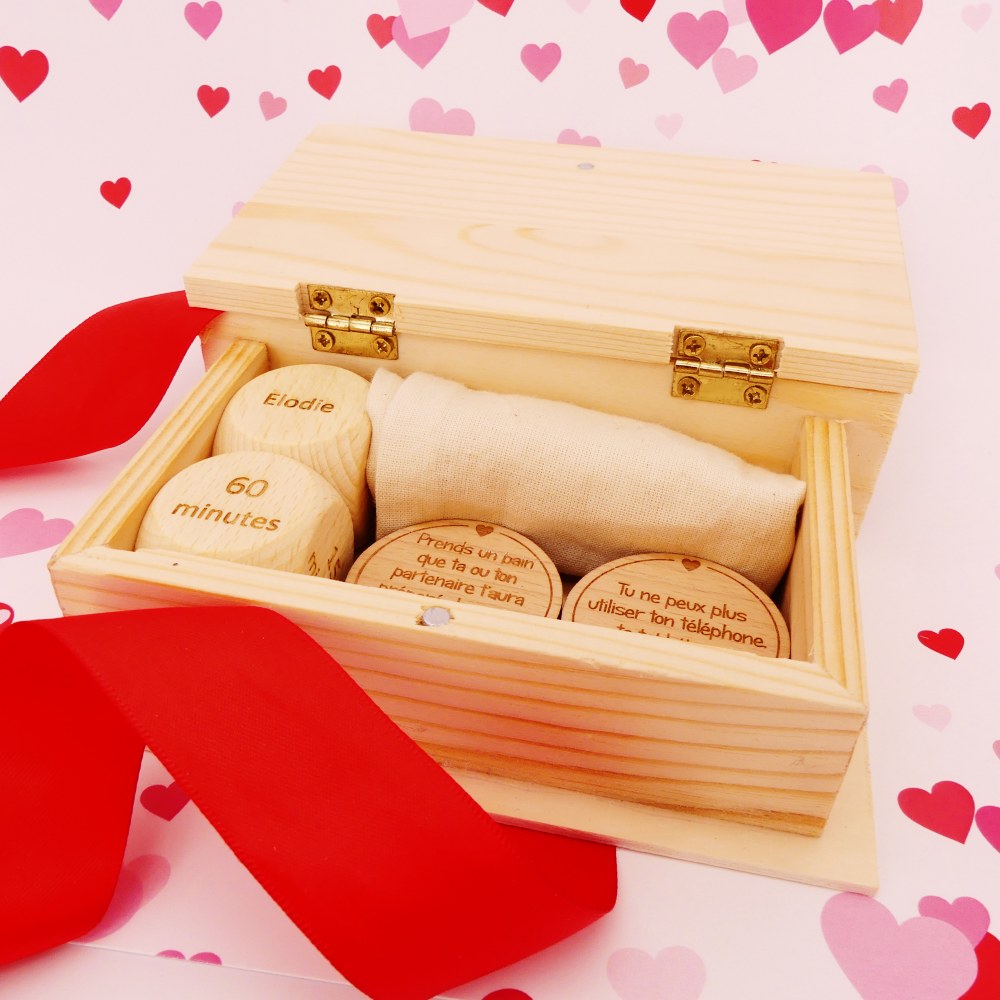 - Contenu : 1 coffret bois, 2 dés (dont 1 personnalisable avec les prénoms du couple), 10 jetons « gages » imposés + de 1 à 5 jetons « gages » personnalisables en option, 1 règle de jeu, 1 sac coton