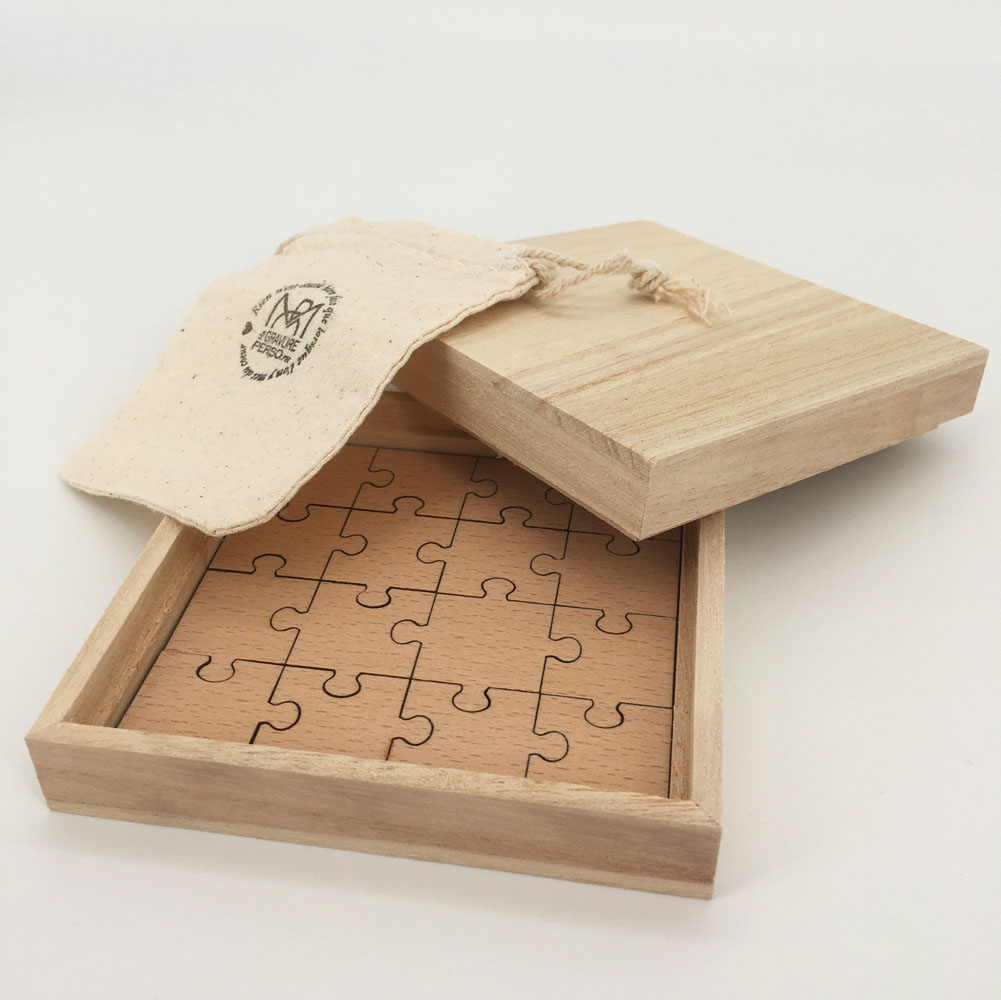 A l’intérieur de cette boîte se cache un sachet en coton. Ce sachet en coton contient un puzzle en bois de hêtre. Faites de ce puzzle la déclaration surprise pour une naissance, une demande en mariage…