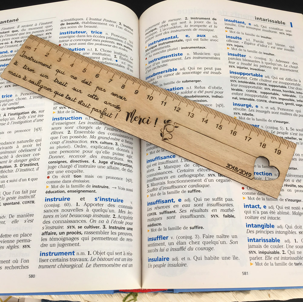 L’école est finie ! Un cadeau pour les maîtres ou les maîtresses qui donne la mesure, La règle graduée bois personnalisée fera un cadeau original et utile à l’instit’ de votre enfant, il ne s’y attend pas. Votre enfant va le surprendre avec cette règle et son message de remerciement. C’est le cadeau idéal pour la fin de l’année scolaire, cette règle est un petit objet d’une part, parfait, et d’autre part, pratique, pour un maître ou une maîtresse, elle se glisse facilement dans sa trousse et aura une belle place sur son bureau. Nous réalisons notre règle graduée dans du bois de bouleau en 1.2mm d’épaisseur.