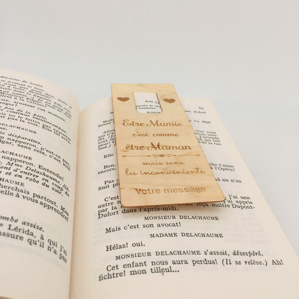Nous réalisons nos marque-pages bois personnalisés dans du bois de contreplaqué en érable de 1 mm flexible. Nos marque-pages bois personnalisés sont gravés au laser avec une incroyable finesse et précision. Vous aurez forcément un coup de cœur avec le Marque-page Etre mamie que vous pourrez personnaliser pour en faire le cadeau unique. N’hésitez pas à fouiller dans la catégorie des marque-pages personnalisés, vous aurez certainement envie d’en refaire un autre. Nous fabriquons tous marque-pages dans notre atelier en Normand. Alors, nous vous souhaitons de bonnes lectures, et c’est sûr… vous ne perdrez plus jamais la page !