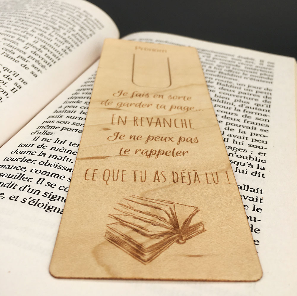Nous réalisons nos marque-pages bois personnalisés dans du bois de contreplaqué en érable de 1 mm flexible. Nos marque-pages bois personnalisés sont gravés au laser avec une incroyable finesse et précision. Vous aurez forcément un coup de cœur avec le Marque-page l’Amnésique que vous pourrez glisser dans votre livre préféré. N’hésitez pas à fouiller dans la catégorie des marque-pages personnalisés, vous aurez certainement envie d’en refaire un autre. Nous fabriquons tous nos marque-pages dans notre atelier en Normandie. Alors, nous vous souhaitons de bonnes lectures, et c’est sûr… vous ne perdrez plus jamais la page !