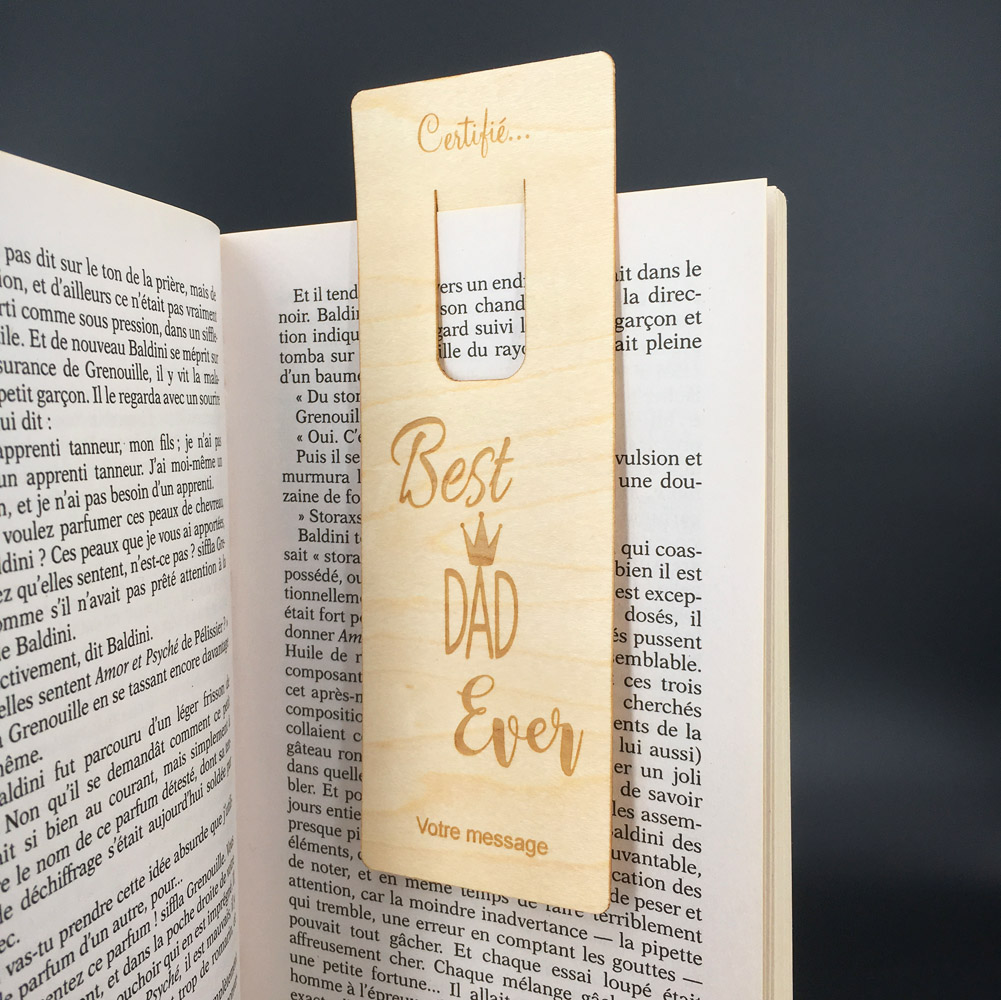 Nous réalisons nos marque-pages bois personnalisés dans du bois de contreplaqué en érable de 1 mm flexible. Nos marque-pages bois personnalisés sont gravés au laser avec une incroyable finesse et précision. Vous aurez forcément un coup de cœur avec le Marque-page Le best dad que vous pourrez personnaliser pour en faire le cadeau unique. N’hésitez pas à fouiller dans la catégorie des marque-pages personnalisés, vous pourrez découvrir d’autres modèles sur la même thématique. Nous fabriquons tous nos marque-pages dans notre atelier en Normandie. Alors, nous vous souhaitons de bonnes lectures, et c’est sûr… vous ne perdrez plus jamais la page !