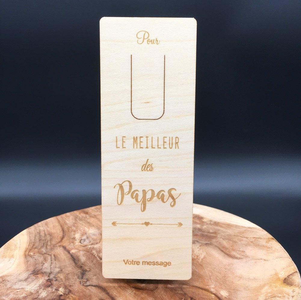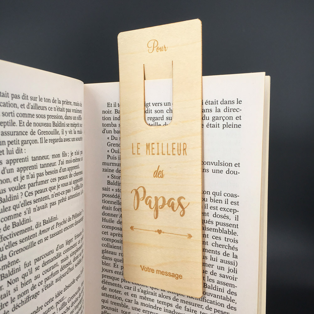 Nous réalisons nos marque-pages bois personnalisés dans du bois de contreplaqué en érable de 1 mm flexible. Nos marque-pages bois personnalisés sont gravés au laser avec une incroyable finesse et précision. Vous aurez forcément un coup de cœur avec le Marque-page Le meilleur des papas que vous pourrez personnaliser pour en faire le cadeau unique. N’hésitez pas à fouiller dans la catégorie des marque-pages personnalisés, vous pourrez découvrir tous les modèles que nous proposons. Nous fabriquons tous nos marque-pages dans notre atelier en Normandie. Alors, nous vous souhaitons de bonnes lectures, et c’est sûr… vous ne perdrez plus jamais la page !
