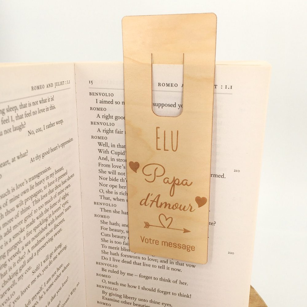 Nous réalisons nos marque-pages bois personnalisés dans du bois de contreplaqué en érable de 1 mm flexible. Nos marque-pages bois personnalisés sont gravés au laser avec une incroyable finesse et précision. Vous aurez forcément un coup de cœur avec le Marque-page Papa d’amour que vous pourrez personnaliser pour en faire le cadeau unique. N’hésitez pas à fouiller dans la catégorie des marque-pages personnalisés, vous aurez certainement envie d’en refaire un autre. Nous fabriquons nos marque-pages en France dans notre atelier en Normandie. Alors, nous vous souhaitons de bonnes lectures, et c’est sûr… vous ne perdrez plus jamais la page !