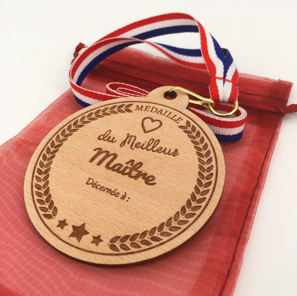Vous savez bien qui mérite cette médaille bois meilleur maître ?  Vous allez pouvoir remercier le maître de votre enfant et lui dire combien il a été important pour lui et pourquoi il mérite cette médaille ! Il n’est pas utile d’organiser une cérémonie officielle à l’école pour lui mettre cette médaille autour du cou, mais, une chose est sûre : cette récompense honorera cet instituteur. Il vous suffit pour cela de renseigner son prénom, son surnom au recto de la médaille bois.