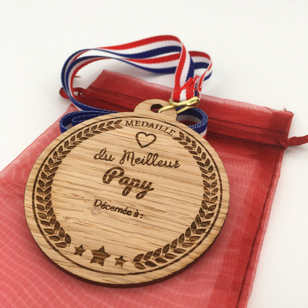 Vous savez bien qui mérite cette médaille bois meilleur papy ? Vous allez pouvoir lui dire, à votre grand-père, combien il est important pour vous et pourquoi il mérite cette médaille ! Il n’est pas utile d’organiser une cérémonie officielle pour lui mettre cette médaille autour du cou, mais, une chose est sûre : cette récompense honorera votre papy. Il vous suffit pour cela de renseigner son prénom, son surnom au recto de la médaille bois.