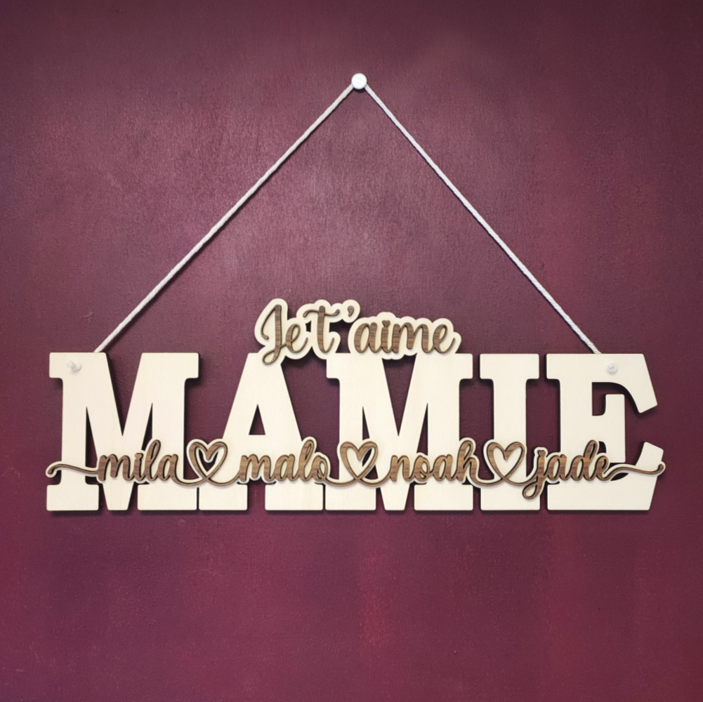 - Prénoms et « je t’aime » découpés en CP noyer épaisseur 3 mm et contrecollés sur le mot MAMIE