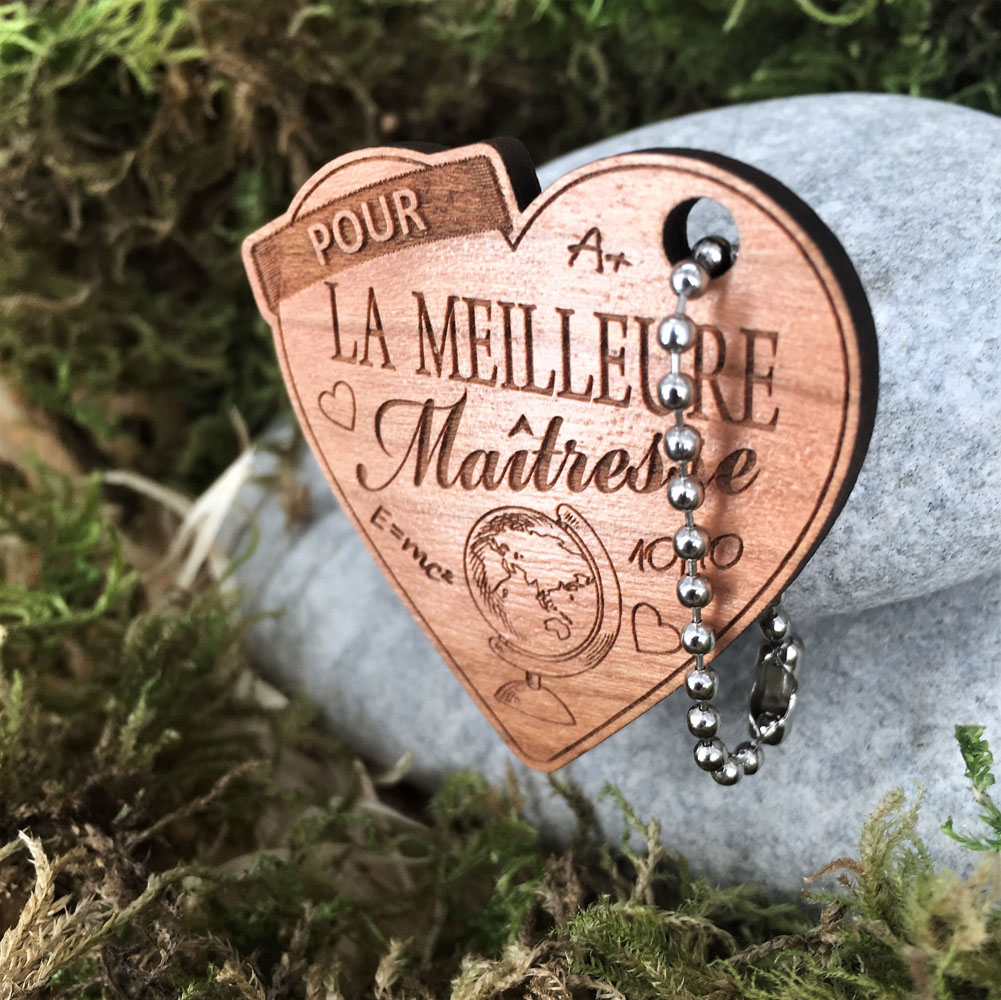 Tous nos porte-clés bois sont personnalisables soit sur une seule face, soit sur les 2 faces. Ajoutez votre texte ou votre prénom ou bien une citation de votre choix. Vous pouvez également personnaliser en ajoutant des cliparts proposés sur beaucoup de nos produits personnalisables. Nous réalisons nos porte-clés personnalisés dans du bois de contreplaqué vernis de 3mm. Nos porte-clés personnalisés sont très résistants et la gravure laser est d’une incroyable finesse et précision. Vous aurez forcément un coup de cœur avec le Porte-clés bois La meilleure maîtresse que vous pourrez personnaliser pour en faire le cadeau unique. Nous fabriquons tous nos produits en France dans notre atelier en Normandie.