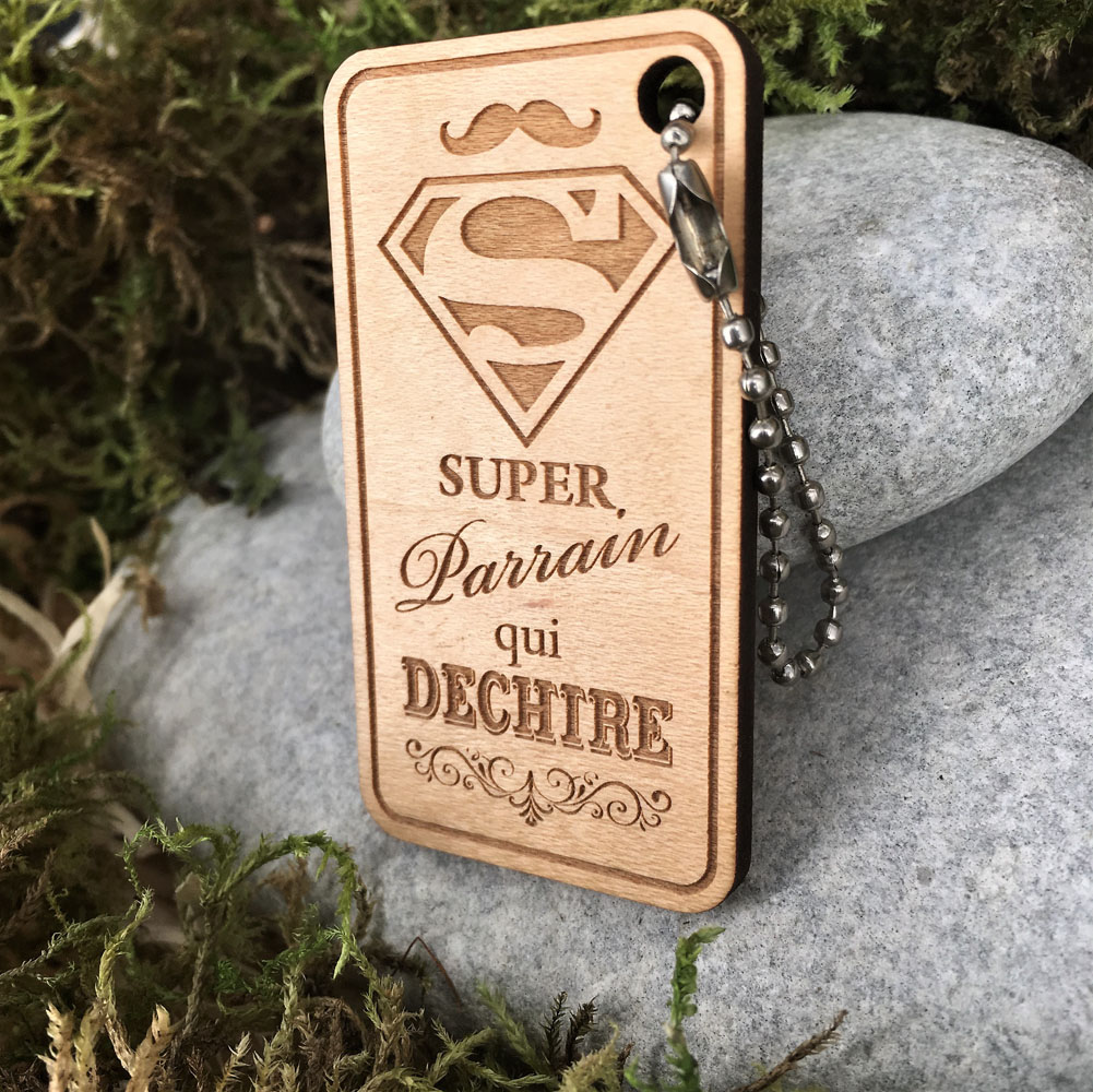 Tous nos porte-clés bois sont personnalisables soit sur une seule face, soit sur les 2 faces. Ajoutez votre texte ou votre prénom ou bien une citation de votre choix. Vous pouvez également personnaliser en ajoutant des cliparts proposés sur beaucoup de nos produits personnalisables. Nous réalisons nos porte-clés personnalisés dans du bois de contreplaqué vernis de 3mm. Nos porte-clés personnalisés sont très résistants et la gravure laser est d’une incroyable finesse et précision. Vous aurez forcément un coup de cœur avec le Porte-clés bois Le super parrain que vous pourrez personnaliser pour en faire le cadeau unique. Nous fabriquons tous nos produits en France dans notre atelier en Normandie.