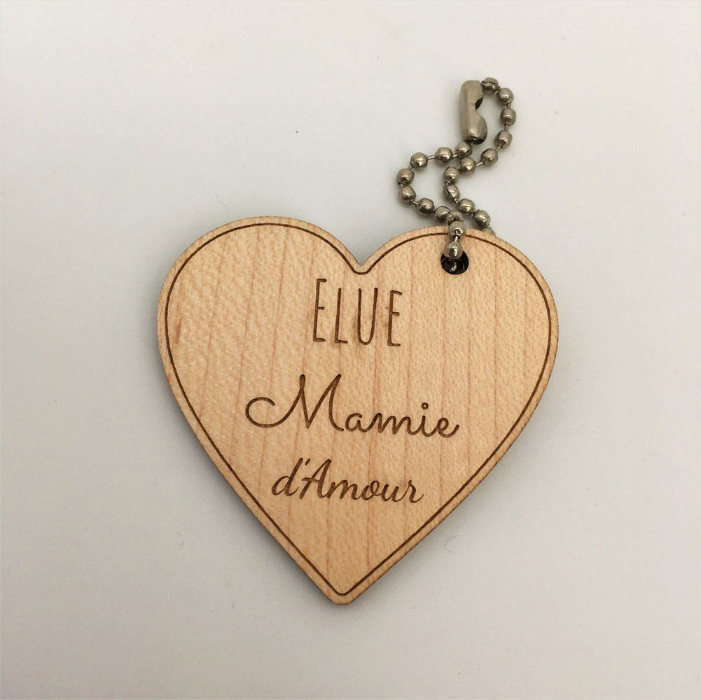 Tous nos porte-clés bois sont personnalisables soit sur une seule face, soit sur les 2 faces. Donc vous pourrez y ajouter votre texte ou votre prénom ou bien une citation de votre choix. Vous pouvez également personnaliser en ajoutant des cliparts proposés sur beaucoup de nos produits personnalisables. Nous réalisons nos porte-clés personnalisés dans du bois de contreplaqué vernis de 3mm. Nos porte-clés personnalisés sont très résistants et la gravure laser est d’une incroyable finesse et précision. Vous aurez forcément un coup de cœur avec le porte-clés bois Mamie d’amour que vous pourrez personnaliser pour en faire le cadeau unique. Nous fabriquons tous nos marque-pages dans notre atelier en Normand.