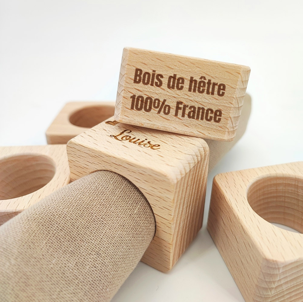 Notre Rond de serviette bois personnalisé est issu de l’atelier d’un artisan du Loir-et-Cher avec qui nous aimons collaborer car son travail est toujours d’une très grande qualité ainsi que le bois qu’il utilise (hêtre de Bourgogne-Franche-Comté). Votre personnalisation par la gravure laser en fera un cadeau touchant que vous pourrez offrir en de multiples occasions. Cadeaux pour un mariage, fête des grands-mères ou des grands-pères, pendaison de crémaillère, anniversaire ou Noël ! Un cadeau personnalisé fait toujours plaisir ! Vous aurez forcément un coup de cœur avec notre produit que vous pourrez personnaliser pour en faire le cadeau unique.