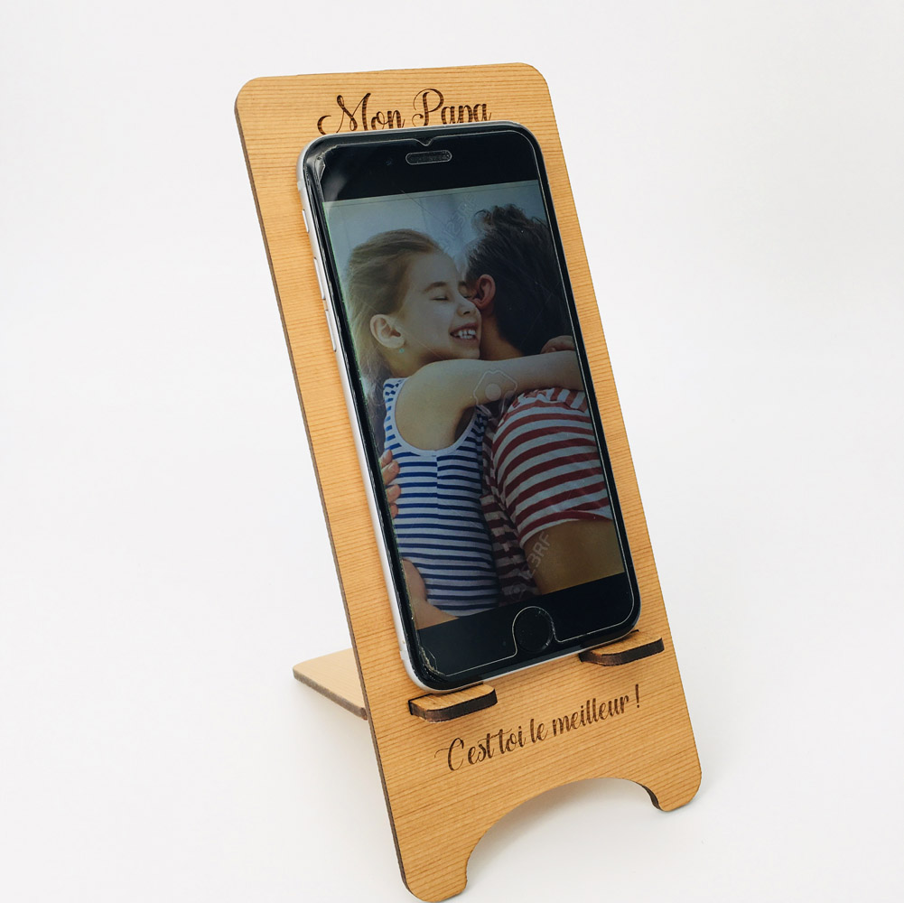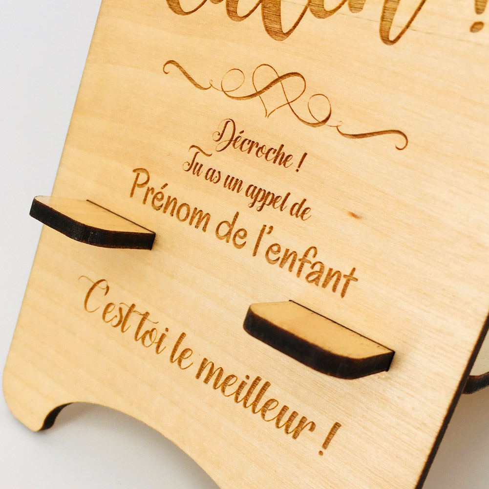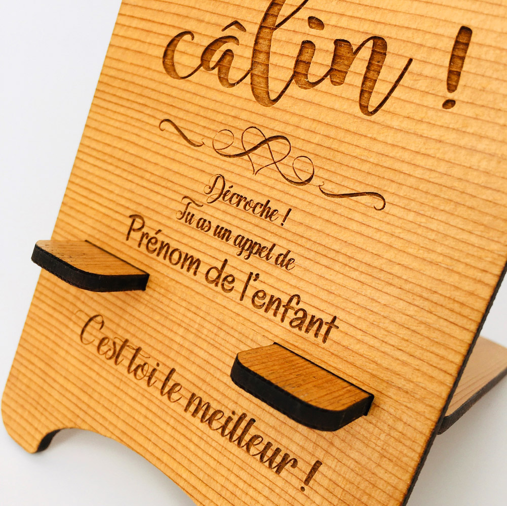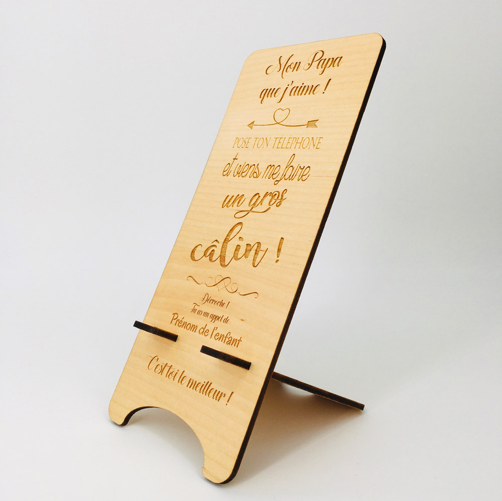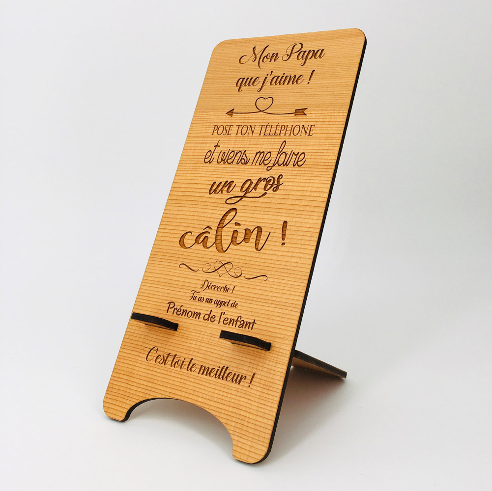Voici un support de téléphone en bois papa câlin qui a du caractère ! Une belle idée cadeau pour un papa connecté. C’est un accessoire pratique et stable pour poser son téléphone portable, le laisser se reposer en charge ou pour visionner quelques vidéos. Avec son message sans équivoque mais teinté d’une certaine tendresse, le gros câlin ne tardera pas à faire son chemin. Un cadeau idéal pour la fête des pères, un anniversaire, ou pour faire plaisir tout simplement. Le support de téléphone est en bois érable ou cèdre, il est composé de deux parties à assembler par emboîtement avec une personnalisation possible pour y graver le prénom de votre enfant. Un cadeau à petit prix, idéal pour toutes occasions. Notre support convient pour tous types de téléphone portable avec une surface de pose de 8,5 cm de largeur et de 15 cm de hauteur.